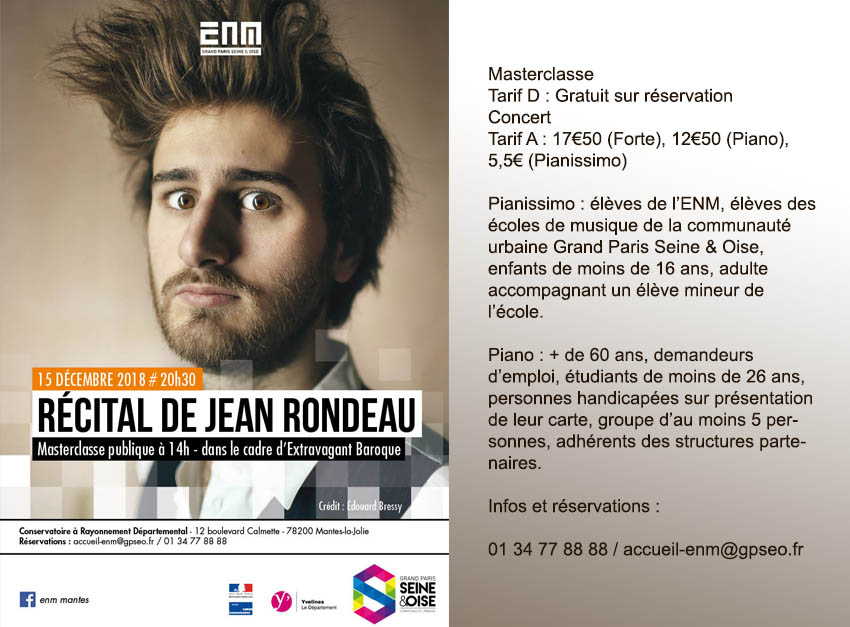 Il obtient le Prix de Clavecin à l’unanimité avec mention Très Bien et Félicitation du Jury au CNSM de Paris en Juin 2013 ainsi que son prix de Basse Continue la même année avec Mention Très Bien à l’unanimité également. Jean Rondeau a également obtenu par le passé les prix de composition et de contrepoint au Conservatoire de Paris!