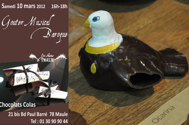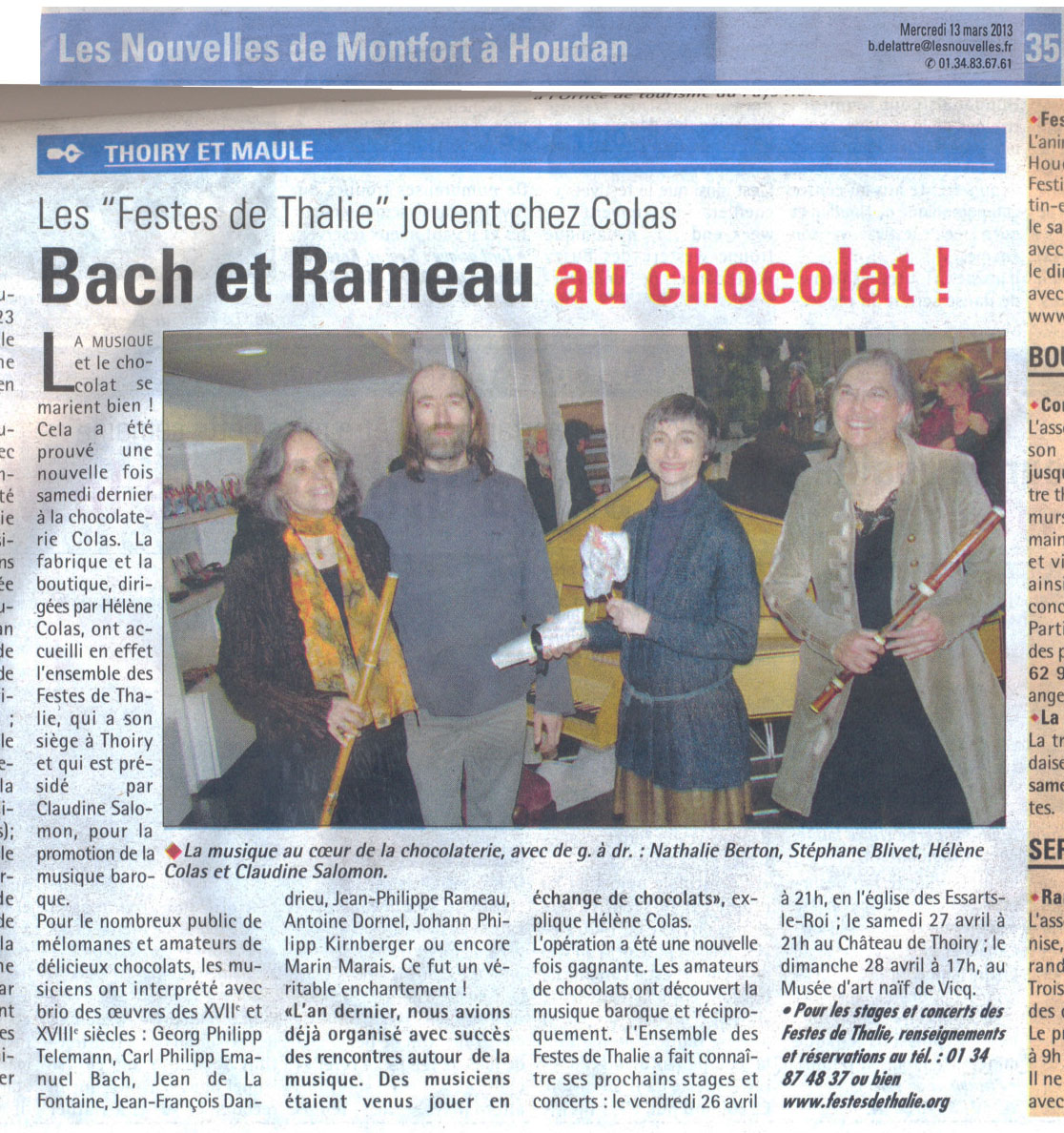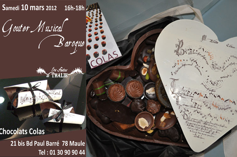 Invité pour la première fois le 10 mars 2012 chez le chocolatier Colas à Maule qui célèbrait la musique dans ses compositions en chocolat, l'Ensemble "les Festes de Thalie" vous a fait partager des moments musicaux au milieu de saveurs et odeurs irrésistibles